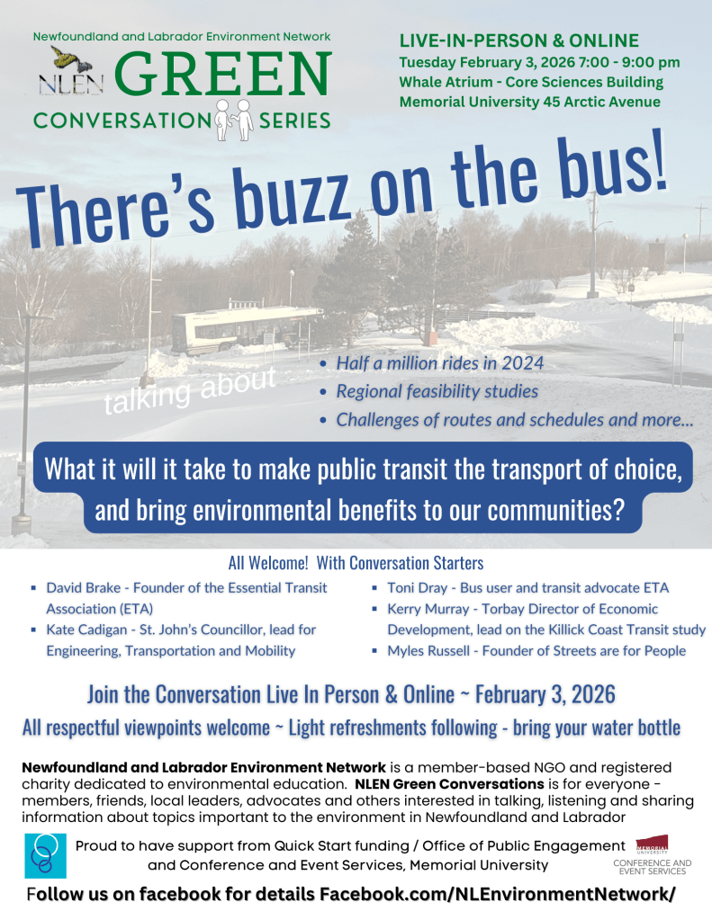 This conversation focuses on sustainability in uncertain times. Approximately 60+ organizations in this province are dedicated to building a stronger, healthier environment. ENGOs and members of the public will join NLEN and resource people in conversation about topics that will help individuals, the public, and the planet move forward with resilience.