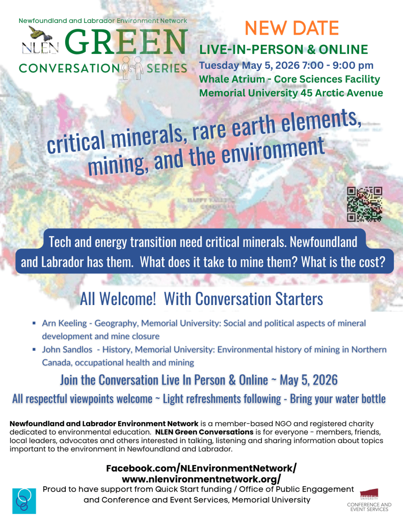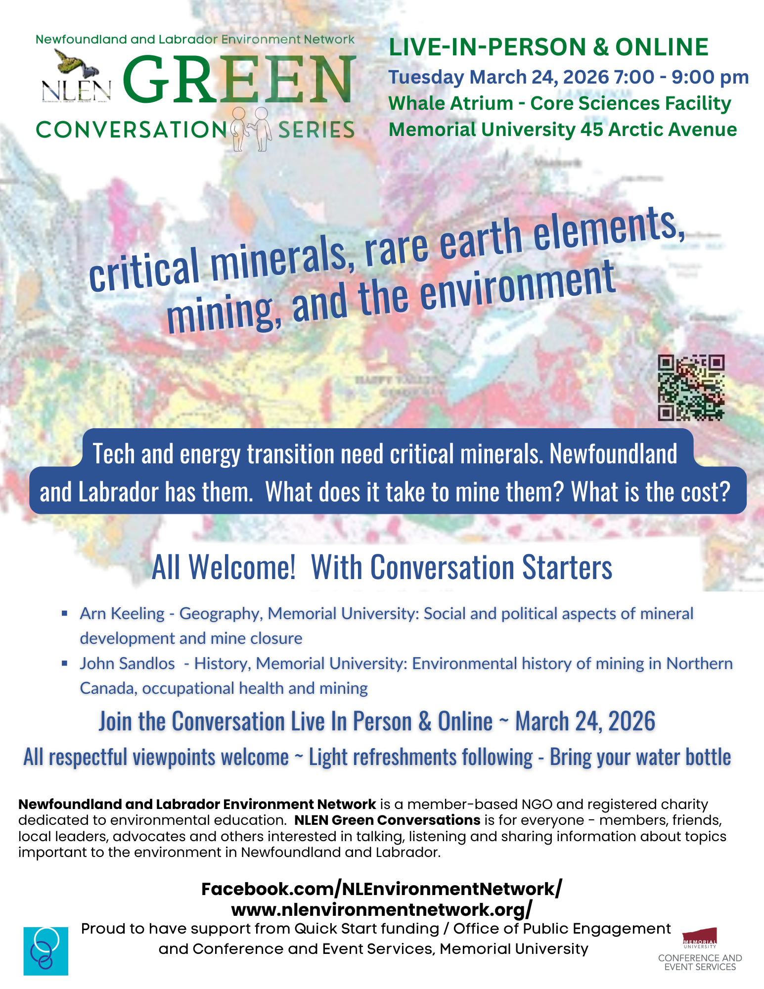 The NLEN Green Conversation Series is a loosely-structured, moderated, 75 minute unscripted program developed to engage dialogue and consideration about environmental-related topics important to our province and our collective future amongst members of the community. All are welcome participants (live and online).