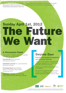 ST. JOHN’S – On Sunday April 1, a public forum on “The Future We Want” will be held at The Lantern, 35 Barnes Rd., St. John’s. Author and journalist Gwynne Dyer will give the keynote address at 7:30pm where he will discuss the importance of building of global green economy.